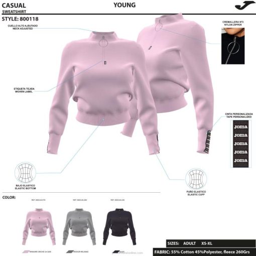 Women’s crop sweatshirt. It features a zip fastening with ring pull, high neck and ribbed hem and cuffs for a more comfortable fit. It is made in a cotton and fleece fabric on the inside, providing softness, comfort and warmth to the athlete.